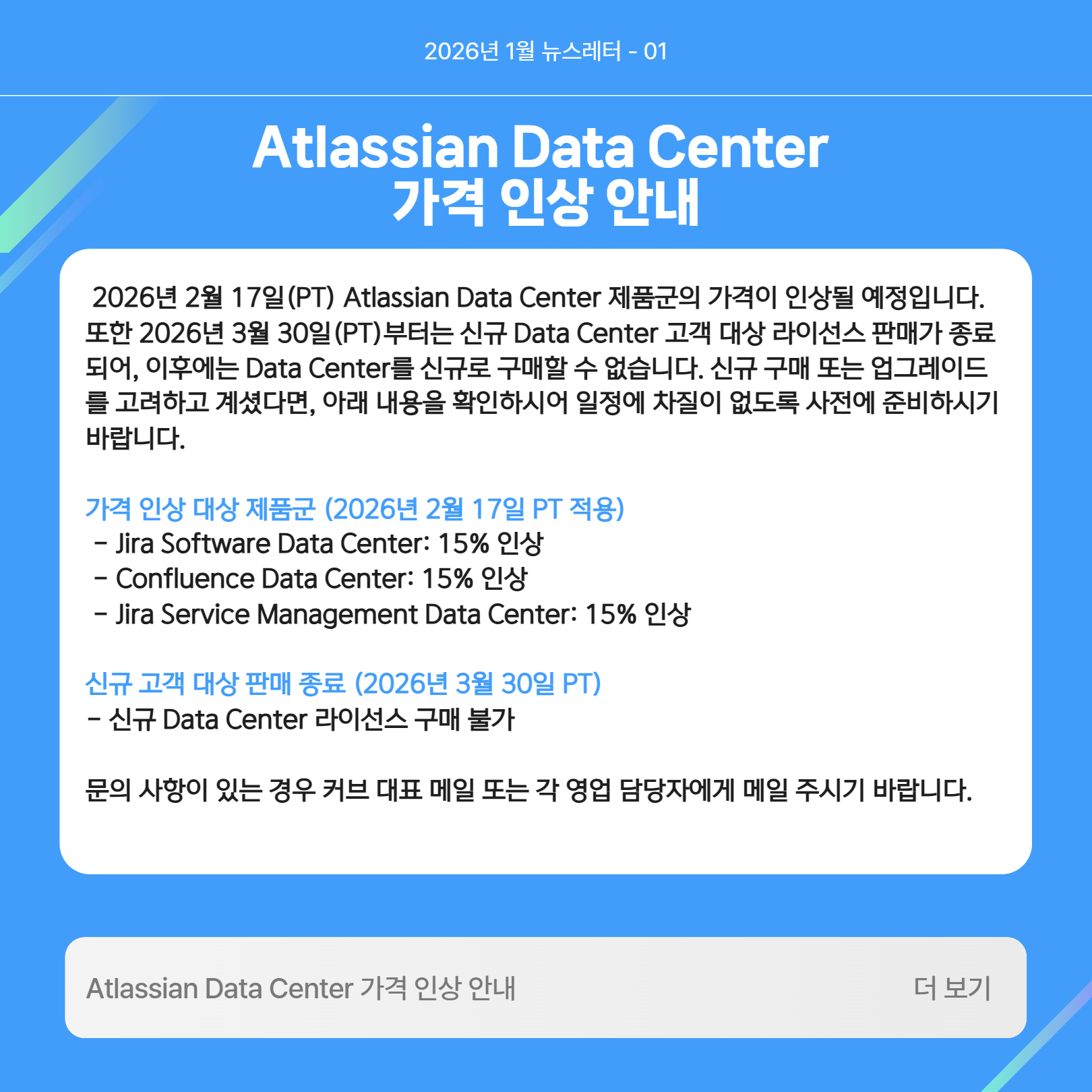 이번 1월 뉴스레터에서는 Atlassian 제품과 관련해 주요 업데이트를 정리했습니다. Atlassian Data Center 제품군 가격 인상 및 신규 고객 대상 판매 종료 일정,