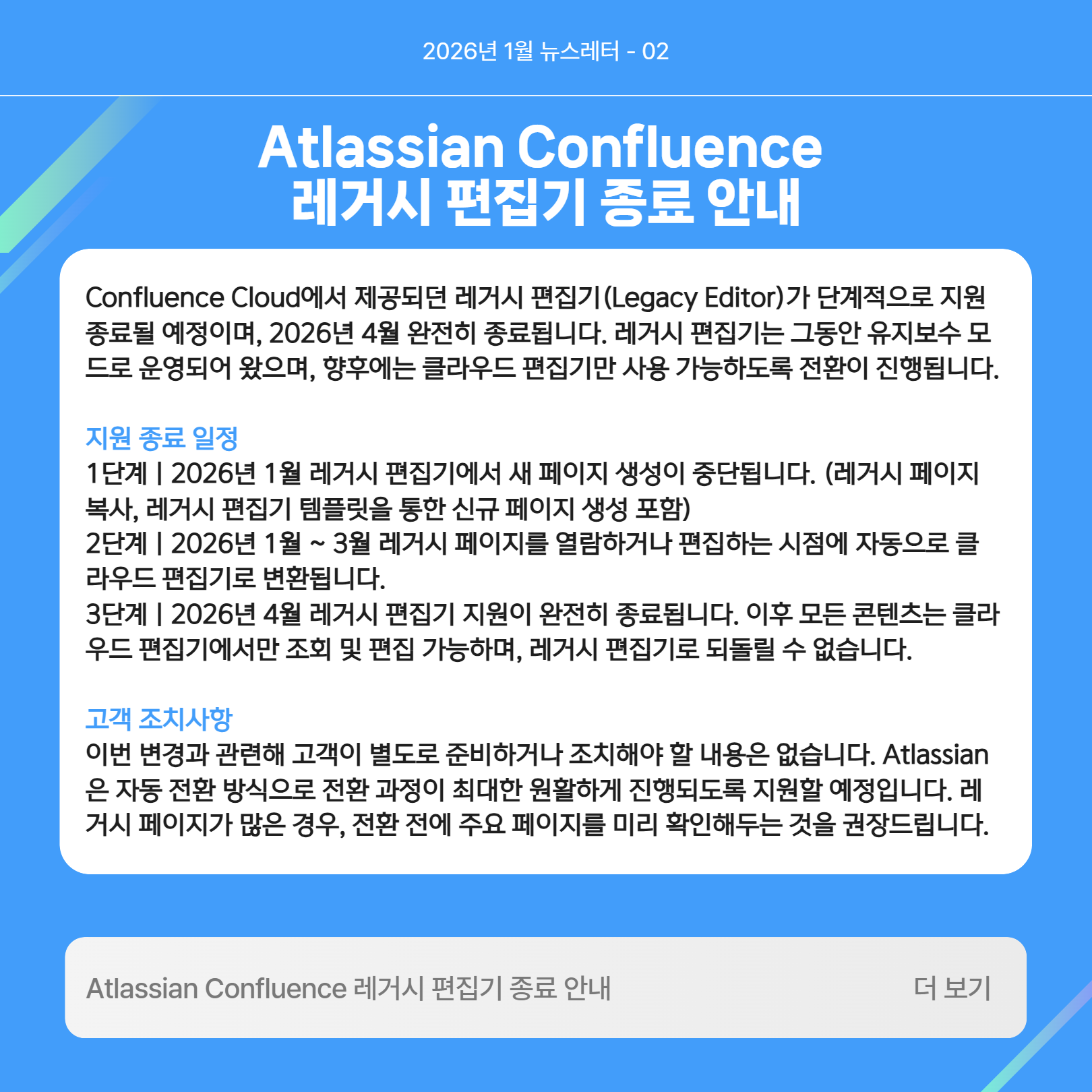 그리고 Confluence Cloud 레거시 편집기(Legacy Editor) 지원 종료 일정을 함께 안내드리니, 적용 시점과 영향 범위를 미리 확인해보시기 바랍니다.