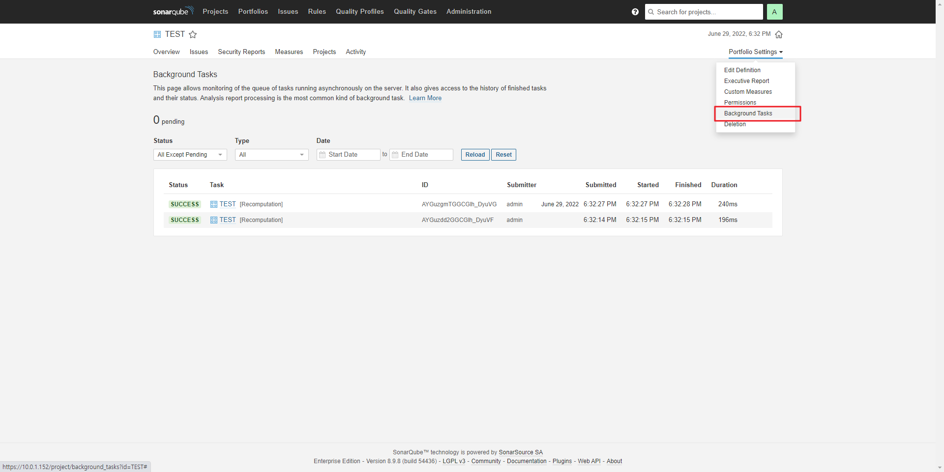 해당 Job은 Portfolio Settings → Backgroud Tasks에 확인 할 수 있다.