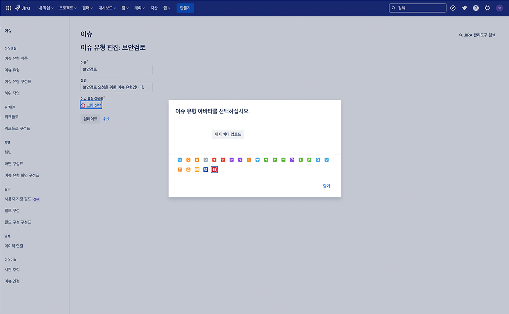 4 이슈 유형 편집 페이지에서 그림 선택 메뉴를 클릭합니다.