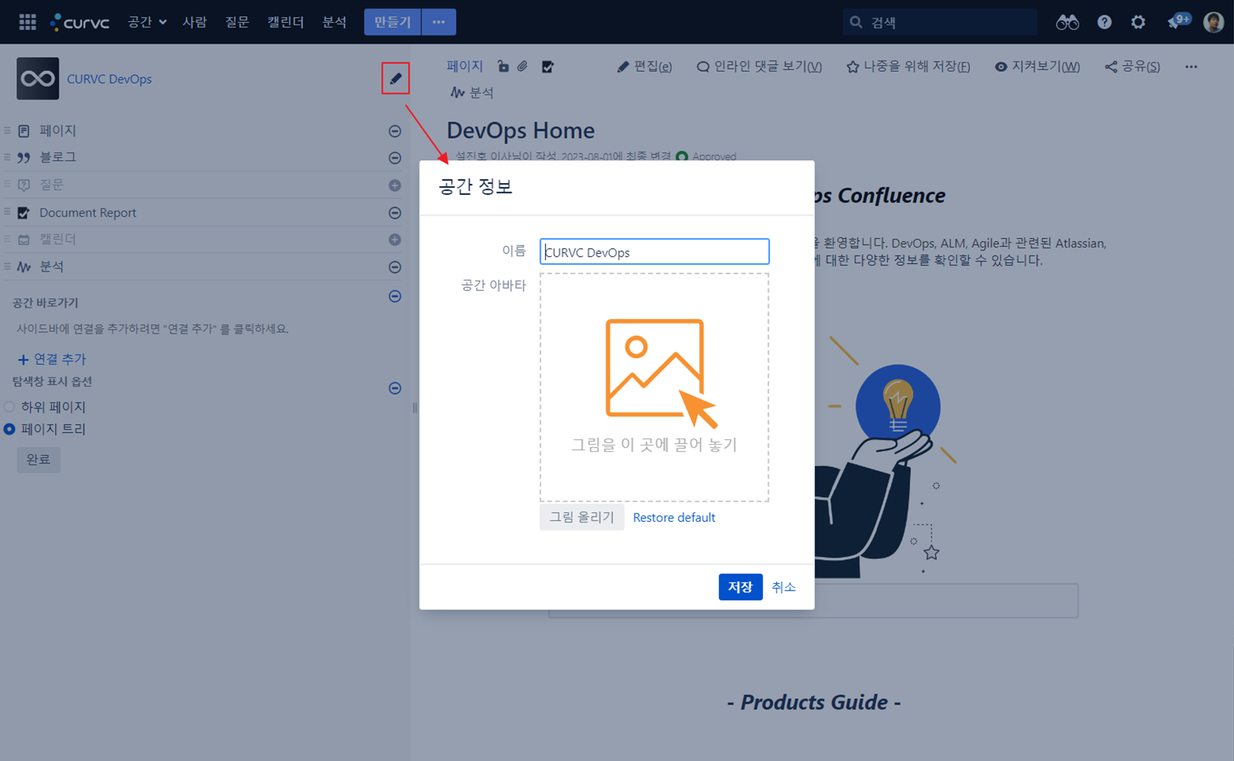 2 사이드바에서 공간 정보 편집(연필 아이콘)을 선택합니다. 다음과 같이 공간 정보 창이 나타나면 공간 아바타를 변경 후에 저장합니다.