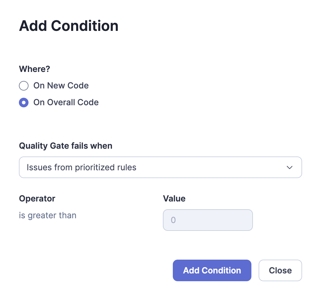 - Add condition을 클릭하고, On Overall Code에서 issues from prioritized rules를 선택하여 조건을 추가합니다.