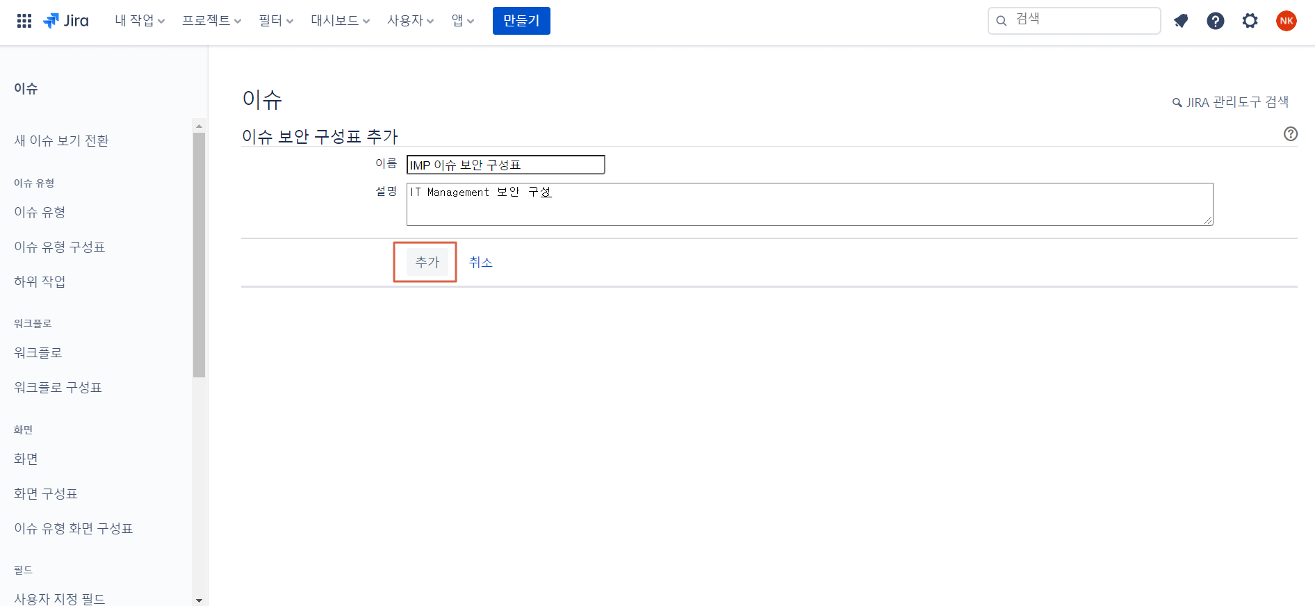- 설정> 이슈 > 이슈 보안 구성표 메뉴 선택 > 이슈 보안 구성표 추가 버튼 클릭